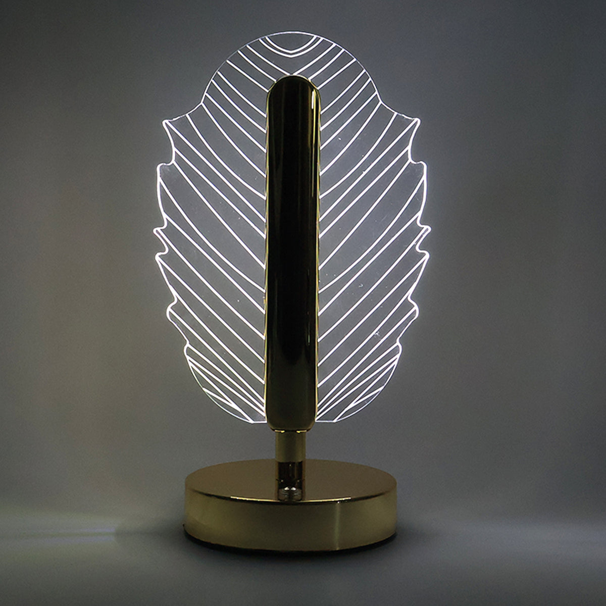 Illuminate your interiors with elegance using this Leaf Shape Crystal Table Lamp. Designed with a unique leaf-patterned crystal-cut acrylic shade mounted on a sturdy metallic base, this lamp brings a sophisticated charm to any room. The built-in LED provides warm ambient lighting, creating a cozy and luxurious atmosphere. With convenient USB charging support, this lamp is both stylish and practical, making it a perfect décor accessory for modern homes, offices, hotels, and gifting purposes.